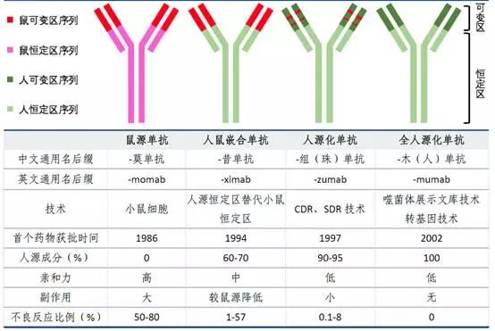 抗体分为人源抗体(Human IgG isotopes)、人源化抗体(Humanized IgG isotopes)和契合型抗体(Chimeric IgG isotopes)3类。人源抗体需要转基因小鼠或者噬菌体(phage),研发成本较高。契合型抗体亲和率较低,会影响免疫原性且造成副作用。相对来说人源化抗体更有优势。下图为各种各种抗体的特点。