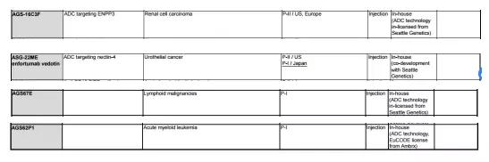 专注纯单抗与ADC,拥有4个临床ADC。投资机会小,其母公司Astellas Pharma是日本公司,还是三菱财团MUFJ的成员。其ADC产品管线如下: