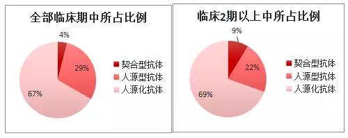 3类抗体在所有ADC临床及上市药物中以及在2期以后药物中所占比例如下图所示。由此可见,人源化抗体更受欢迎,这是由于其性价比高造成的。