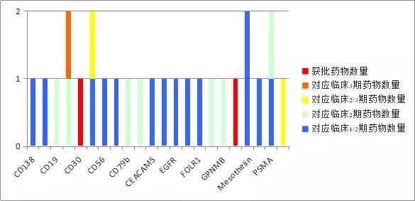 目前各靶点到达临床阶段的ADC药物请见第一章第1节。将各种靶点对应的临床2期以后的药物数量进行统计,可以得到下图。