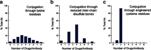 下图为不同连接方式产生的产品中的纯度。图a连接在了lysine上,抗体上80个lysine中有大约30个可供连接,因此成品不太均匀。图b连接在了cysteine上,只有4个interchain disulfide bridge,可连8个毒素,更加均匀(双硫键要么不断,断了就要两边各连一个毒素)。图c是将抗体上的的cysteine数量修改后的结果,这种抗体称为THIOMAB。其他还有cross-link技术,能够将DAR=2~4的比例升为94%(见本章第(3)节)。