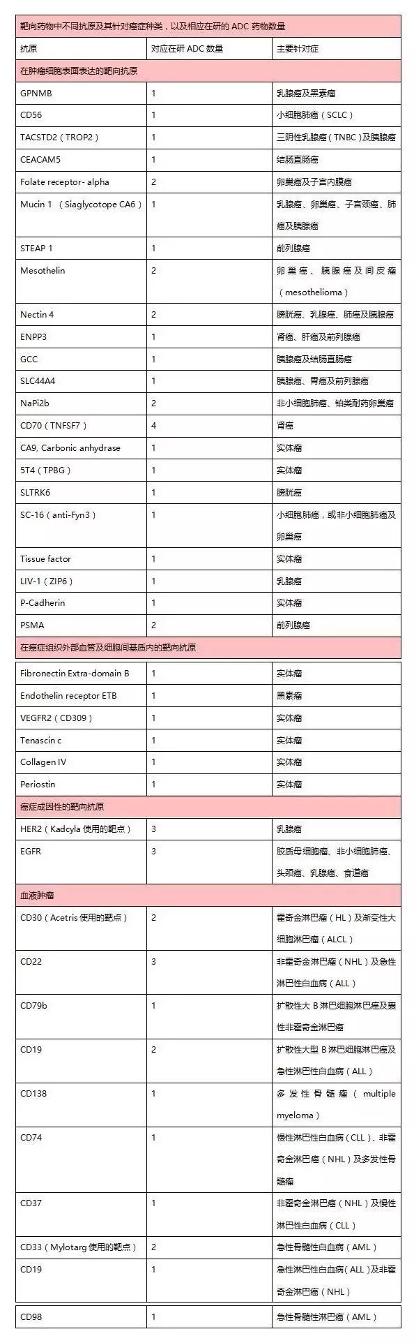 下表为可供使用的各种靶点及其针对的癌症种类。其中,目前已经上市的两款药物中,Kadcyla使用HER2靶点,针对HER2阳性的肺癌; Adcetris使用CD30靶点,针对CD30阳性的霍奇金淋巴瘤Hodgkin Lymphoma (HL)与间变性大细胞淋巴瘤anaplastic large cell lymphoma (ALCL) 。