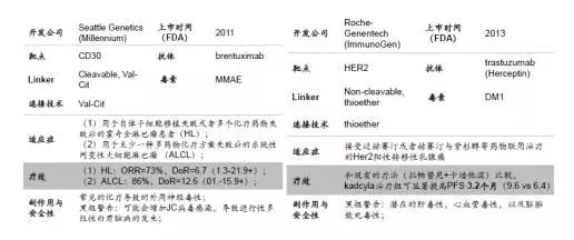 目前在市的ADC药物为2011年上市的武田和Seattle Genetics的Adcetris(CD30抗原)和2013年上市的罗氏旗下Genentech的kadcyla(HER2抗原)。