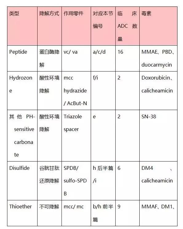 ADC药物的抗体种类(大分子部分)是无限的,连接物、连接方式及毒素的种类(小分子部分)是有限的。作为核心要素,连接物-毒素化合物已经被药企申请了专利。目前FDA临床的各种Linker-drug组合均可归入以下几种: