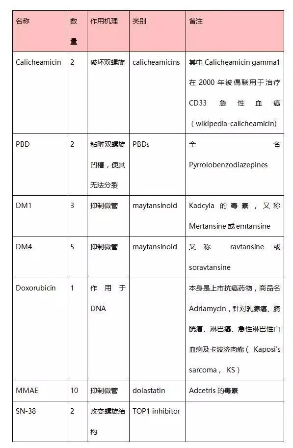 下表为目前正在FDA临床1、2期以上的各种ADC药物中使用的毒素。由此可见,DM1、DM5与MMAE这三种种毒素更受欢迎,研究风险更小。