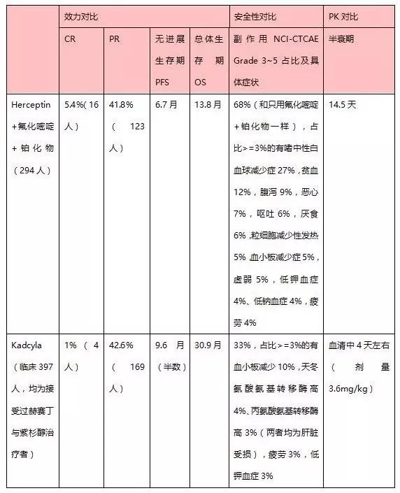 两者的疗效、安全性及PK性质对比如下表所示。需要注意的是两者的临床条件不一样,Kadcyla的临床病人均为已经接受过Herceptin与taxane治疗而复发的,而Herceptin是作为一线疗法进行临床试验的;Kadcyla是单独使用的,而Herceptin是与化疗药氟化嘧啶及铂化物共同使用的。由下表可见,偶联极大加强了原本单抗的疗效,使病人的生存期几乎翻倍。