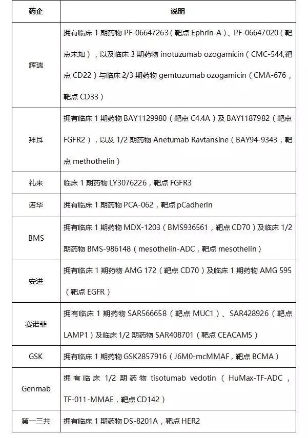 Seattle Genetics, ImmunoGen, Immunomedics, Abzena, Agensys, Celldex, Progenics, Genmab, Sorrento, Abbvie, Genentech, 丽珠单抗等公司官方网站