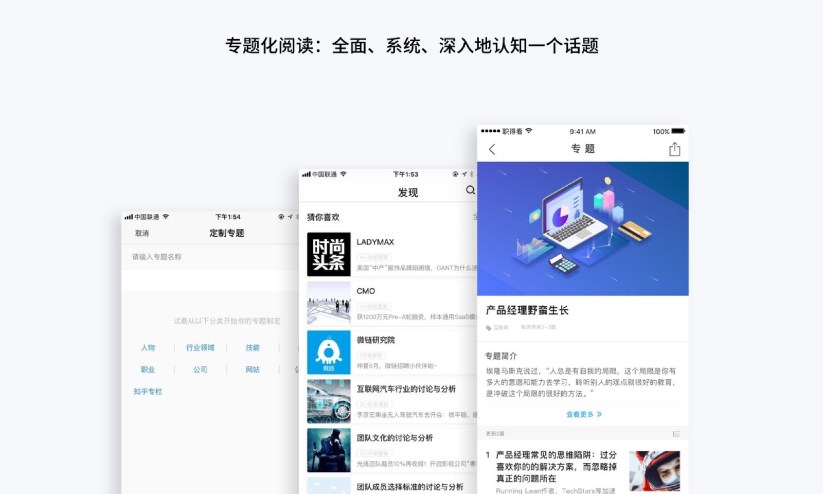 用户也可以以专题形式定制自己感兴趣的内容,“职得看”上现有包括15个领域的大量专题内容,每个专题包括相关的资讯、观点、深度报告、音频、视频等。
