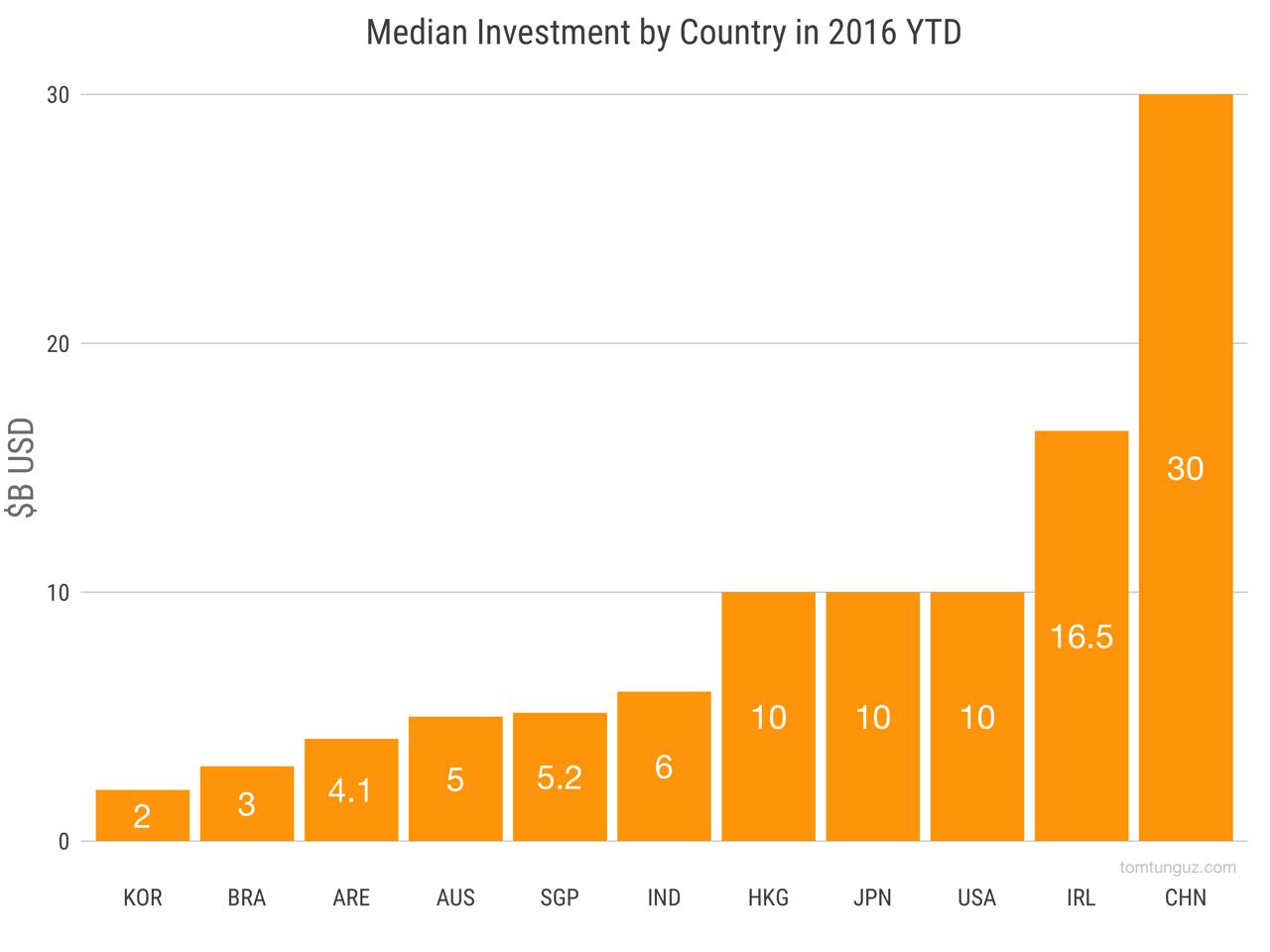 谈到一笔投资的中位数,数据显示,中国在全球排名第三,达三千万美元。爱尔兰以1,650万美元跟随其后,之后的美国、日本和香港也全部高达1000万美元。