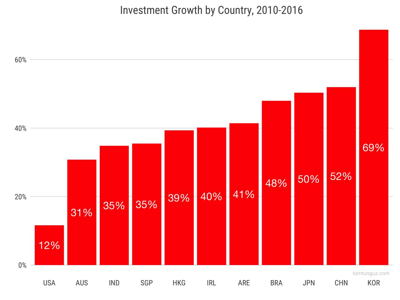 上图显示了2010 - 2016年,10个增长最快的风险投资市场以及美国的风险投资项目A轮至D轮的复合年增长率。在这六年里,美国是增长最慢的市场,全年复合增长率为12%。与此同时,韩国、中国和日本位居三甲。巴西、阿拉伯联合酋长国和爱尔兰分别是第四、第五和第六。