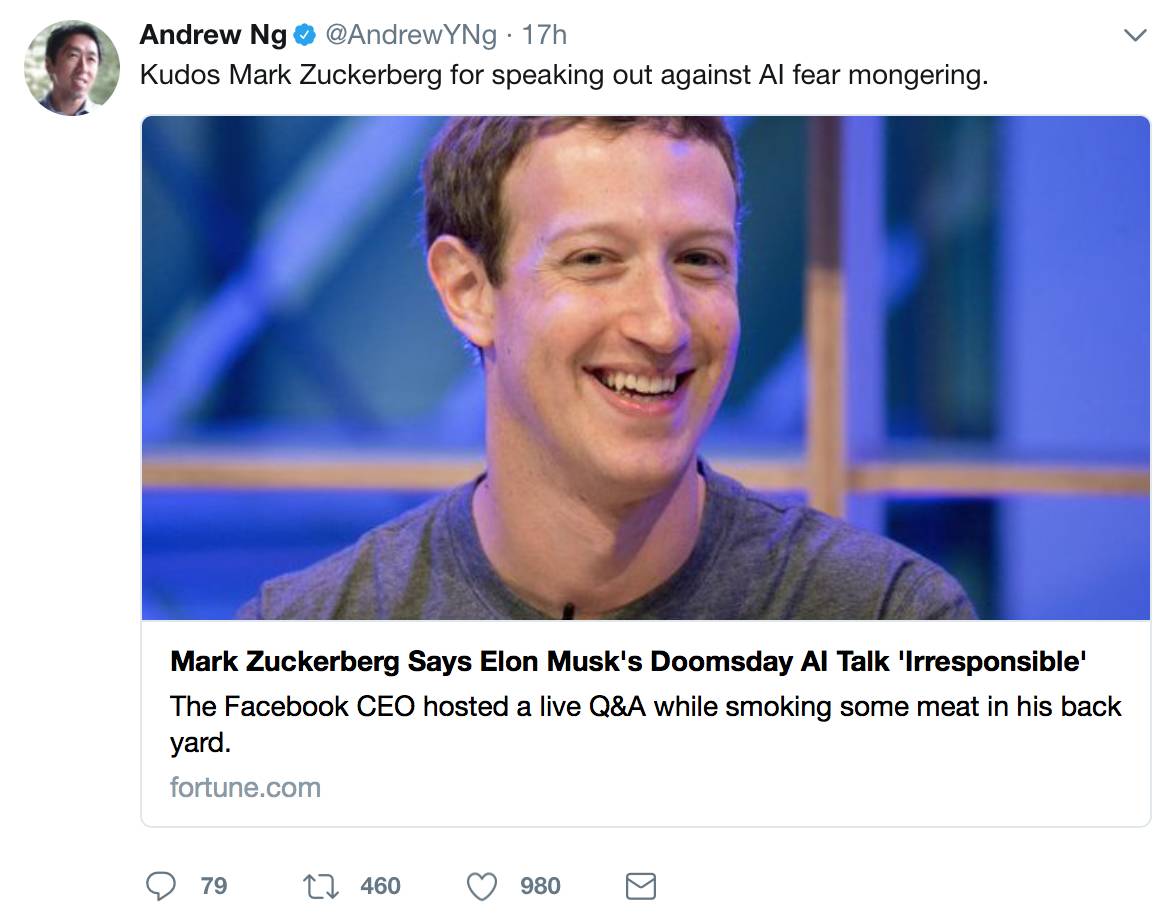前百度首席科学家吴恩达选择挺小扎,并把马斯克的言论称为 “AI恐惧贩子”。