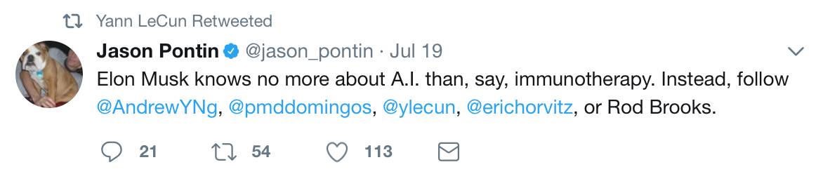 实际上,参与本次AI论战的远不止这两位大佬。在上周,MIT Technology Review的主编Jason Pontin就发推特表示,马斯克对AI了解的不比他对免疫学的了解强多少。此后,Facebook AI研究院的主管Yann Lecun还转发了这条推特。