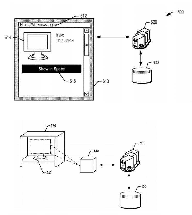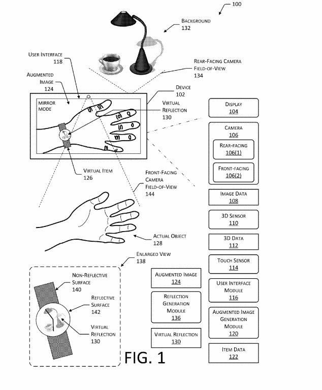 第一项专利名为“增强技术展示”(Augmented Reality Presentation),意味着利用电子商务网站的产品数据,生成高度逼真的AR图像,包括珠宝、眼镜、手表和家具。该专利认为,让消费者在购买前“试用”产品能够减少退货(多数在线零售商的主要支出项)、减少“维护店面的后勤事务和成本”。用摄像头和传感器来追踪消费者及其所在环境,并移动物体,创造“穿戴”体验。
