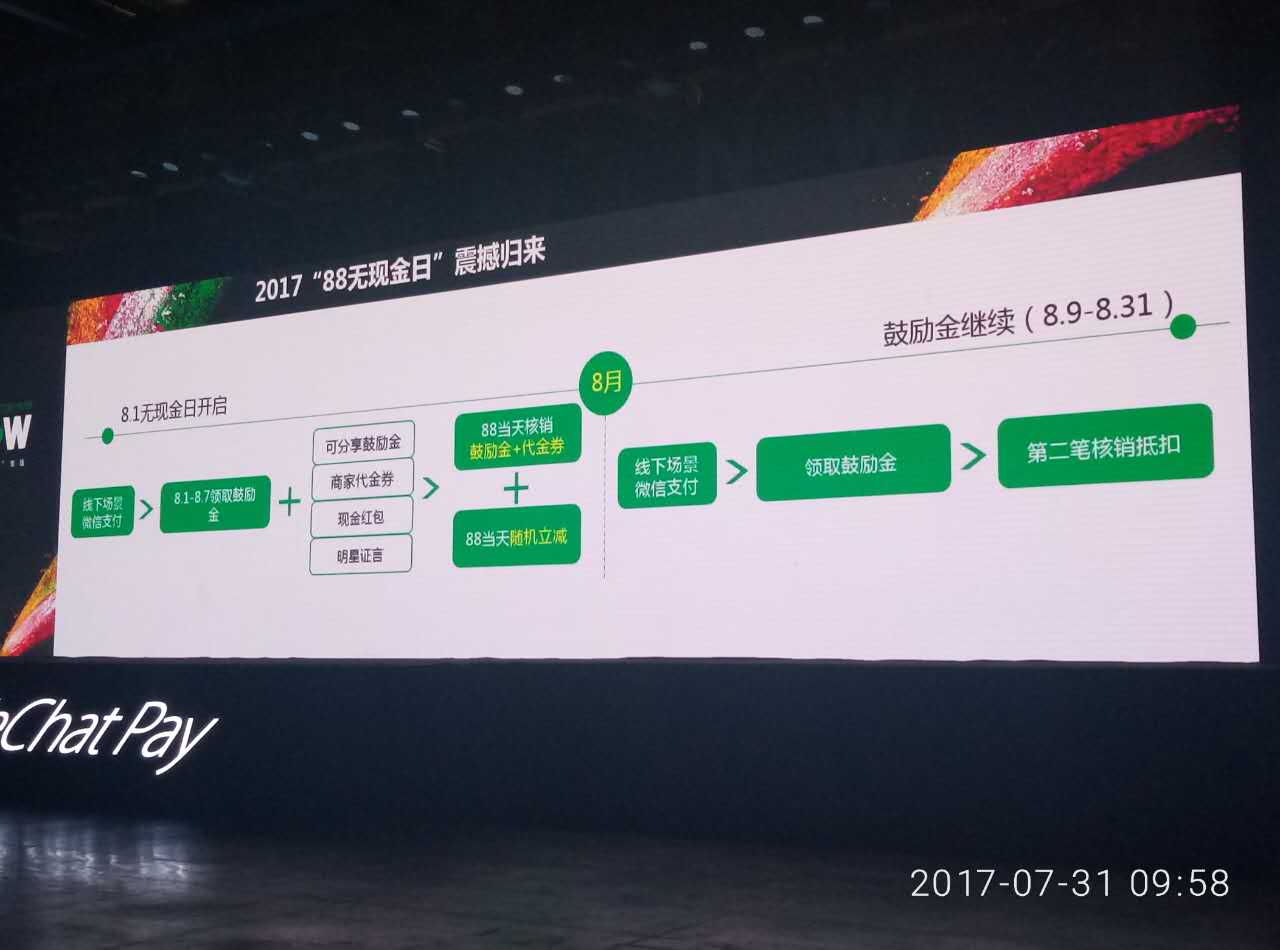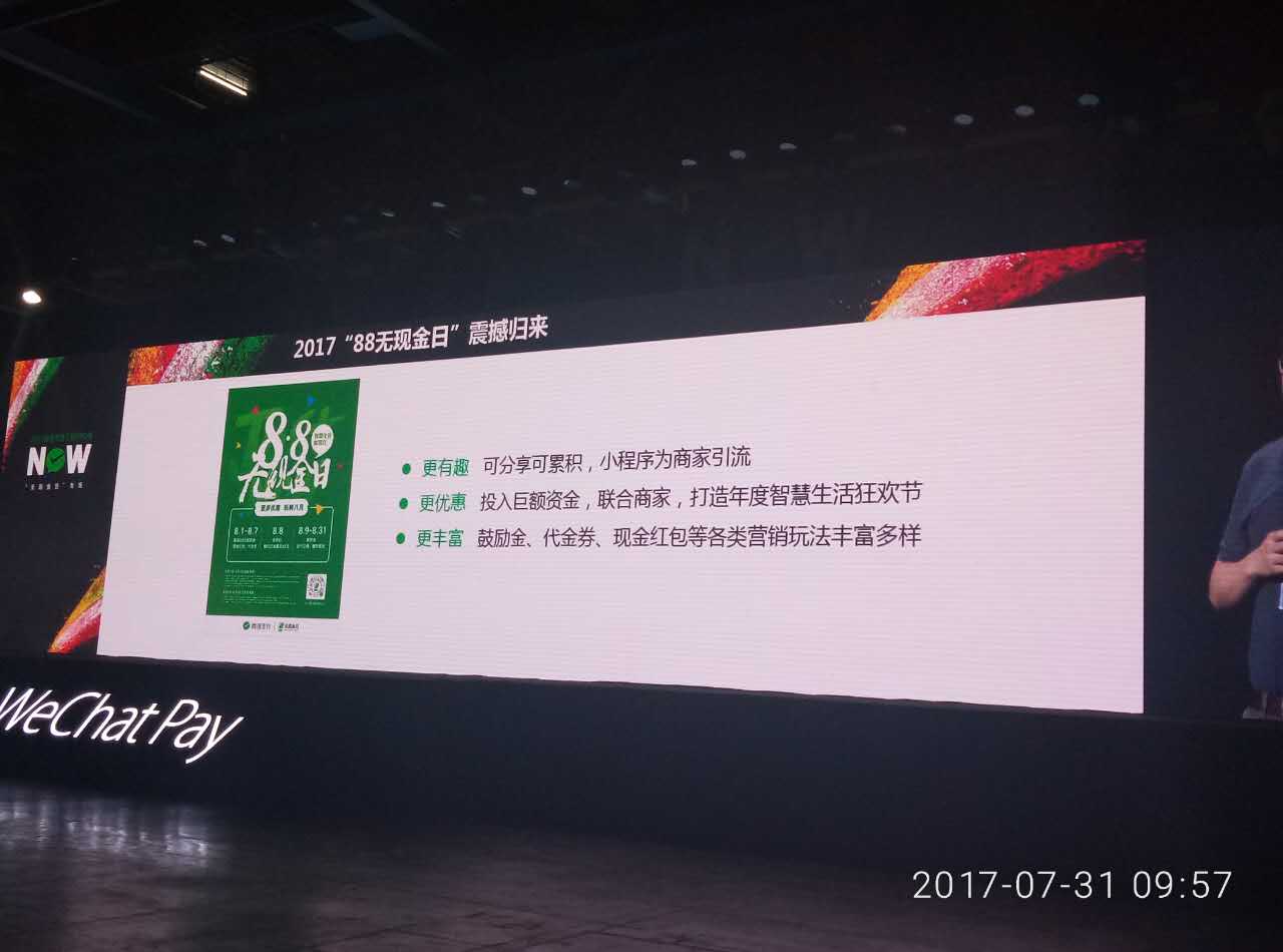 7月31日的微信智慧工坊上,微信支付宣布今年8月将推出新一轮的无现金日活动,活动从1日开始,持续整个月。