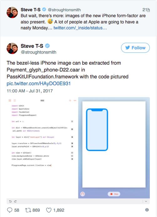 另外,Guilherme Rambo也从智能音箱HomePod中发现了下一代手机的图标。目前,新手机的代码为D22,并且你可以从Apple Pay的框架中找到该图标。这证明了此前的一些曝料以及顶部的新设计,而且这次是直接来自苹果的服务器。