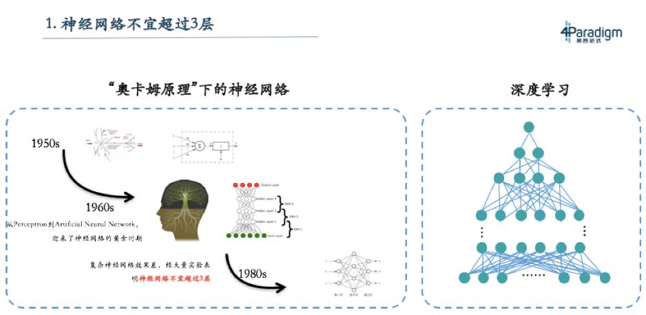 那为什么之前的教科书上会写神经网络不能超过三层,这就要从神经网络的历史说起。五十年代有位科学家叫Marvin Minksy,他是一位生物学家,数学又很好,所以他在研究神经元的时候就在想能不能用数学模型去刻画生物的神经元,因此就设计了感知机。感知机就像一个神经细胞,它能像神经细胞一样连起来,形成神经网络,就像大脑的神经网络。其实在60年代开始的时候,是有很深的神经网络,但当时经过大量实验发现,不超过三层的神经网络效果不错,于是大概到80年代时就得出结论:神经网络不宜超过三层。