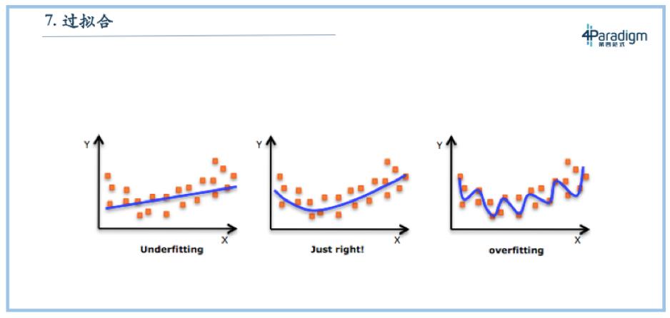 最后一个叫过拟合,这也是一个讨论特别多的话题。以前,通常我们会说如果模型做的太复杂了就会过拟合,如PPT右边所示,而最好的方式应该是图中中间的状态——拟合的刚刚好,图中左边的模型underfitting,没有训练完全。但现在来看,大多数的实际场景都是在拿过去预测未来,过拟合不一定是不好的,还是要看具体场景。如果这个场景是过去见过的情况比较多,新的情况比较少的时候,过拟合反倒是好的。