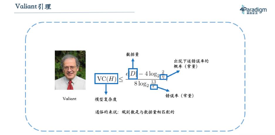 那为什么现在这条结论又被推翻了呢?实际上这条结论是有前提条件的,即在数据量不大的情况下,神经网络不宜超过三层。而从2005年开始,大家发现随着数据增加,深度神经网络的表现良好,所以慢慢走向深度学习。其实这里真正正确的原理是Valiant引理,它可以理解为“模型复杂度(例如专家系统的规则数量)要和数据量成正比”。数据量越大,模型就越复杂。上个世纪因为数据量小,所以神经网络的层数不能太深,现在数据量大,所以神经网络的层数就要做深。这也解释了为什么当时教科书会有这样的结论,而现在随着深度学习的流行,大家已经不再会认为这句话是对的。