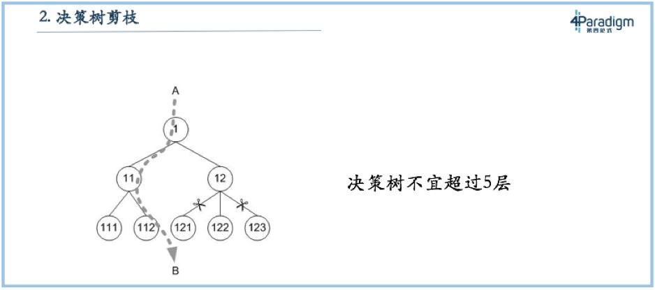 如果有同学看教科书上介绍决策树,会有一个说法就是决策树要减枝,决策树如果不减枝效果不好。还有教科书会告诉决策树不能超过五层,超过五层的决策树效果不好。这个结论和神经网络结论一样,神经网络不能超过三层也是因为当时数据量不大,决策树不能超过五层也是因为上个世纪数据量不够大,二叉树决策树如果深度是N的话,复杂度大概是2的N次方,所以不超过五层复杂度也就是三十多。如果数据量达到一百万的时候,决策树能达到十几二十层的规模,如果数据量到了一百亿的时候决策树可能要到三十几层。