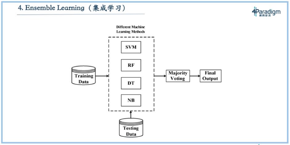 但在现实中,企业做机器学习追求的不是用无限的资源做尽可能好的效果,而是如何充分利用有限资源,获得最好效果。假设企业只有两台机器,如何用这两台机器获得最好的效果呢?如果采用集成学习,用两台机器跑五个模型,就要把两台机器分成五份,每个模型只能用0.4台机器去跑,因此跑的数据量就有限。那如果换种方式,不用集成学习,就用一个模型去跑,就能跑5倍的数据。通常5倍的数据量能比集成学习有更好的效果。在工业界比较少会应用集成学习,主要是因为工业界绝大多数的场景都是资源受限,资源受限时最好的方式是想办法放进去更多的数据。集成学习因为跑更多的模型导致只能放更少的数据,通常这种效果都会变差。