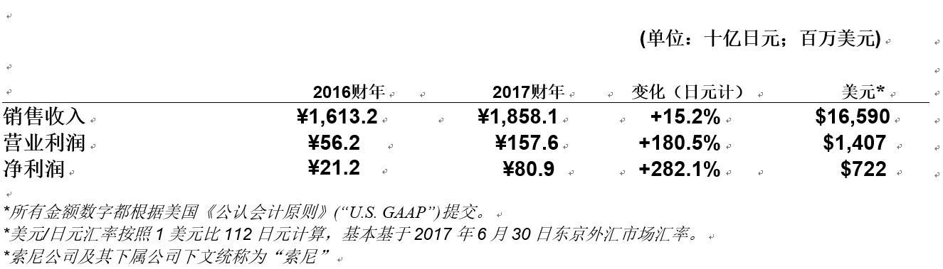 就在刚才,索尼公司公布了 2017 财年第一季度(2017 年 4 月 1 日至 6 月 30 日)业绩数字,如下: