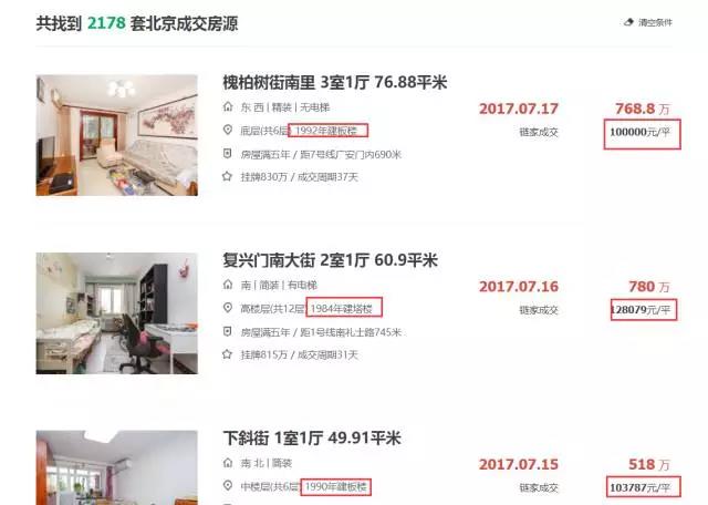 据链家网的二手房挂牌数据显示,大部分在八九十年代建成的住宅报价都在10万元/平米网上,其中有一套1983年建成、房龄已经超过三十年的小区,40平米的一居室报价则将近15万元/平米。而从成交数据来看,也是依然壮观。