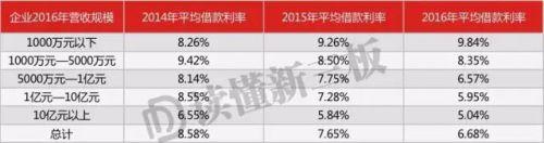 营收规模在1000万元以下的企业,2014年平均借款利率为8.26%,2016年为9.84%;营收规模在10亿元以上的企业,2014年平均借款利率为6.55%,2016年为5.04%。