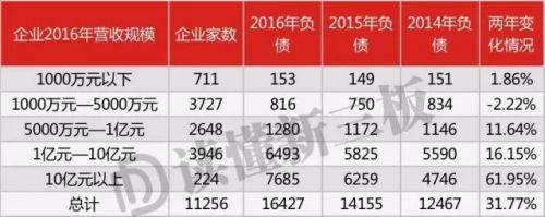 2016年收入规模在10亿元以上的224家企业负债总额从2014年底的4746亿元增长到7685亿元,增长比例达到61.95%。而这些企业在新三板上的融资也不差,在过去两年有123家企业完成融资,融资总额827亿元,要知道这224家企业过去两年进利润总额仅有506亿元。