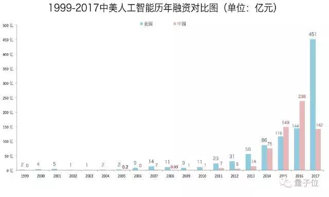 2016年,中国总融资额短暂接近美国,达到492.98亿,距离美国约30亿。但中国在2017年增势放缓,相反的,美国融资则出现井喷,累计融资大幅度超越中国。
