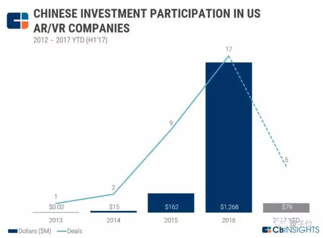 增强现实/虚拟现实(AR/VR)——2012年以来,中国投资者参与了34笔美国AR/VR公司的股权投资,约占同期所有交易的5%以上。其中最大的一笔是阿里巴巴参与的Magic Leap总额7.935亿美元的投资,阿里巴巴执行副总裁蔡崇信还加盟了Magic Leap的董事会。