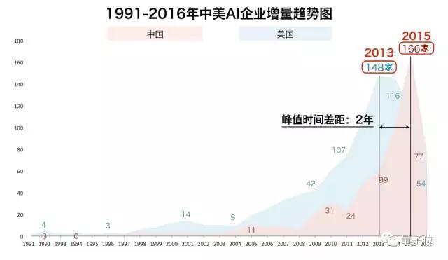 从历史统计来看,美国人工智能企业的发展早于中国5年。