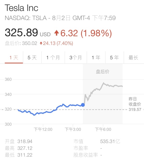 8月2号美股开盘,特斯拉股价一度持续下跌,收盘时勉强涨了一点。但第二季度财报发布和分析师电话会议之后,特斯拉盘后股价大涨7%。