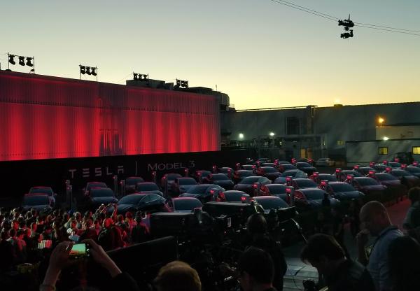 28号的 Model 3 交付仪式上,人们看到一个摇滚明星般的 Elon Musk。