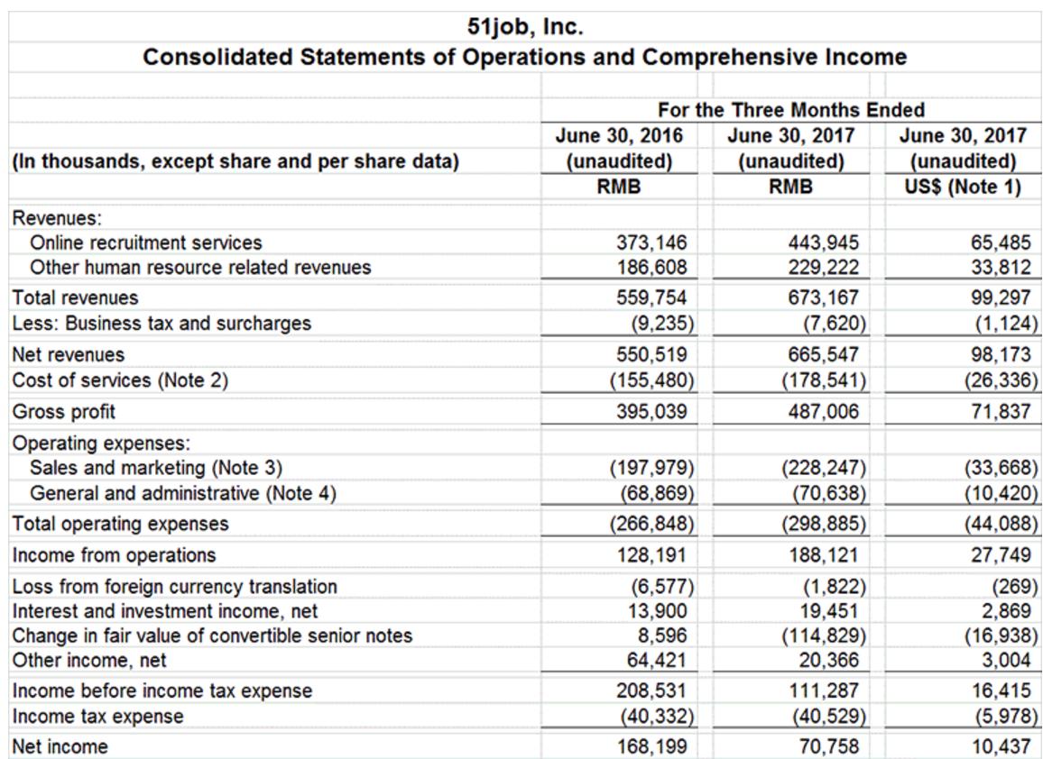 就在这个当口,中国网络招聘第一梯度的前程无忧公司发布了截至6月30日的2017财年第二季度未经审计财报。财报显示,前程无忧第二季度总营收为6.732亿元(约合9930万美元),较上年同期的5.598亿元增长20.3%;归属于前程无忧的净利润为7060万元(约合1040万美元),较上年同期的1.687亿元下降58.2%。