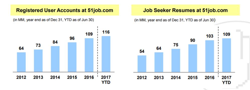根据前程无忧的财务展示数据,截止去年年底,前程无忧的注册用户数有1.09亿人,网站求职者的简历共有1.03亿个。不过,财报并没有公布月活或者日活用户。
