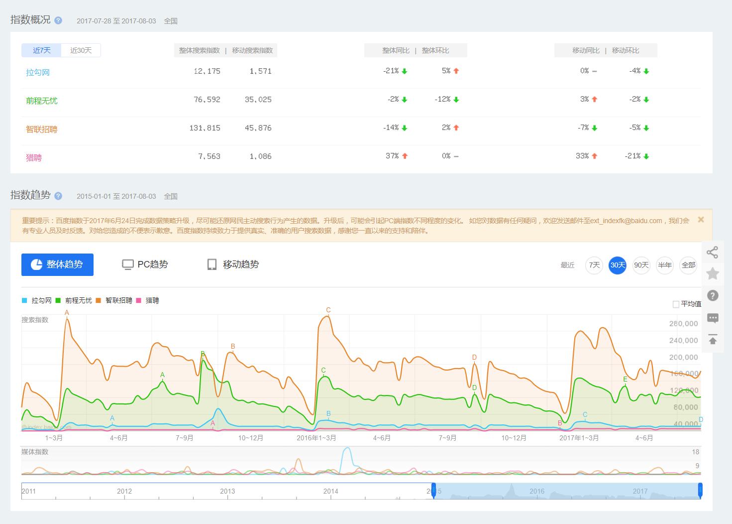 从用户量来看,前程无忧似乎有着不错的基础。不过从百度指数的增长情况来看,对比起新兴的拉勾网,前程无忧的整体同比和环比都呈下降趋势;而且在搜索指数排名来说位于智联招聘后面。(Boss直聘由于最近的风波,搜索指数暴涨,因此未加入对比。)