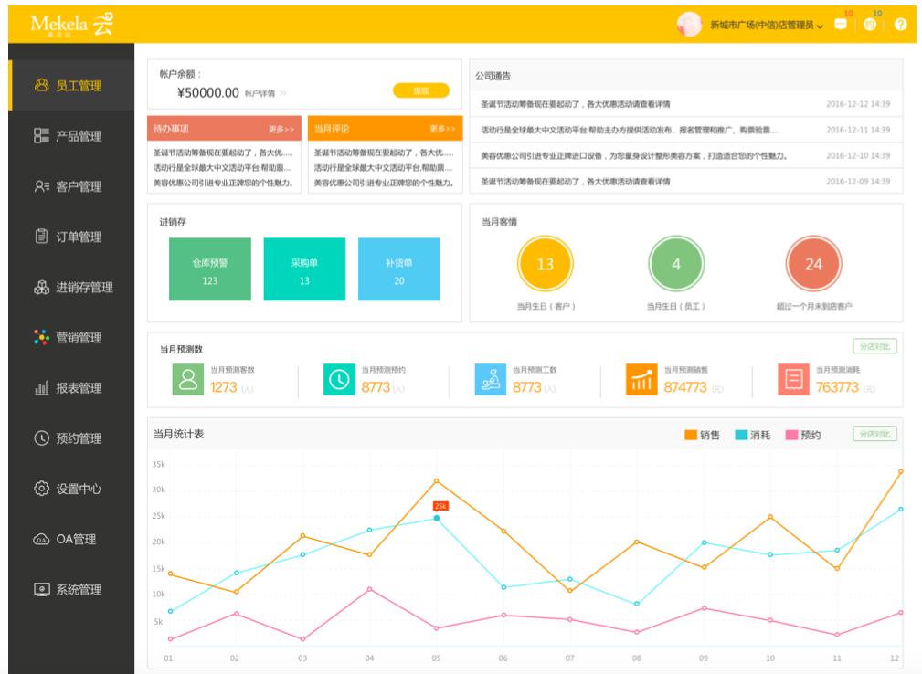 对于老板来说,系统包含了员工管理、产品管理、客户管理、订单管理、进销存管理、营销管理、报表管理等多个板块,可以让他们实现对门店的远程管控。当月客情、门店成本和销售业绩,所有信息一目了然。另外系统还实时提供业绩预测,帮助老板在出现业绩下滑时能及时采取措施。