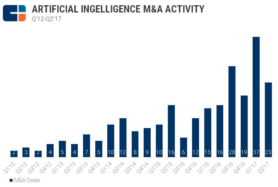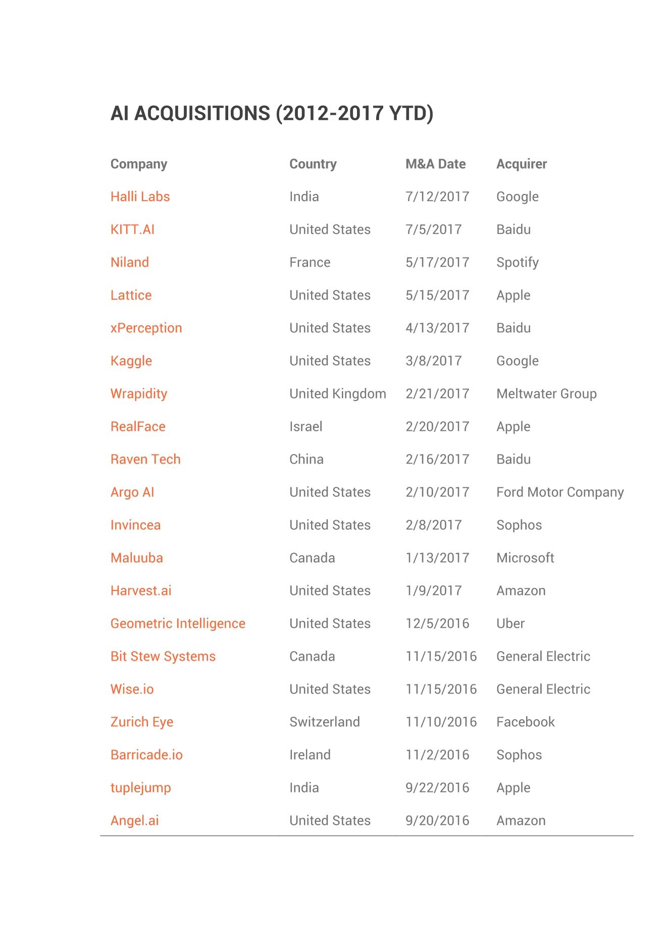 谷歌、IBM、雅虎、英特尔、苹果和Salesforce等行业巨头,连同新入场者福特、三星、通用电气和优步等正在竞相收购人工智能创业公司。自2012年以来,已经有超过250家研究人工智能算法的创业公司被收购,仅在2017年第一季度就有37家收购情况。福特公司以10亿美元收购Argo AI,成为这一季度最大的并购交易事件之一。百度今年的人工智能收购表现尤为积极,包括于本季度收购由亚马逊的Alexa基金支持的Kitt.ai在内,至此已有3起并购交易。