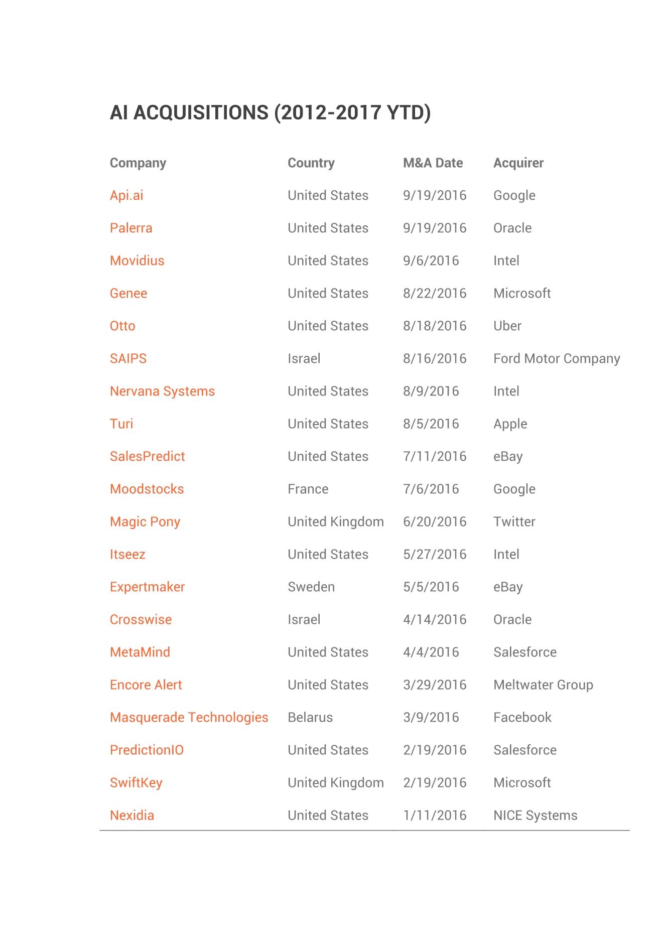 英特尔、微软、Facebook并列第三。英特尔仅在2016年就收购了Itseez,,Nervana Systems,和Movidius 3家初创公司。最近,Facebook收购了白俄罗斯的Masquerade Technologies和瑞士的Zurich Eye。微软近期则收购了Genee和研究AI交流的初创公司Maluuba