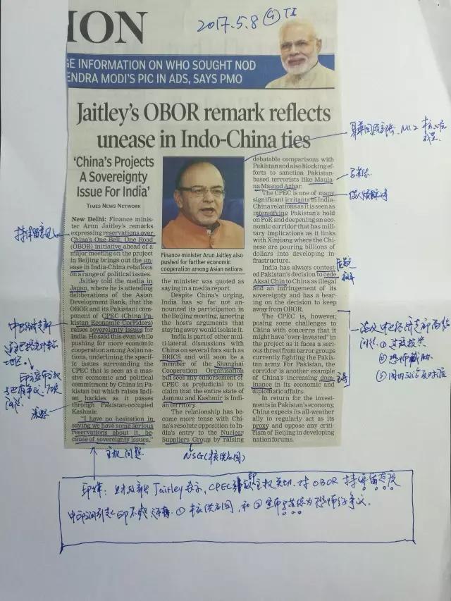 在印度,每天的报纸一般都会有来自中国的报道,经济政治文化军事,负面消极的消息多,正面积极的消息少,猜疑泛酸搅和的文章多,理性平和合作的文章少。发行量巨大的Times of India,中国的报道很多出现在其nation版,而不是在主要评论其他国家地区的world版,且常以威胁批判为基调,足见其非理性的重视。在内容方面,西藏问题、边境问题和中国威胁总是热点,去年以来的中国反对其加入NSG和针对联合国恐怖组织清单等事项一直被热炒,意图是说中国阻止了印度的发展道路。而“一带一路”在印度官方媒体的眼里更是取其印度洋霸权的“眼中钉”、“肉中刺”,讨论之余牵出的主流解决方案都是遏制中国。这次的对峙,更有媒体说,中国是因为担心被印度超越,所以要武力阻止,这里面逻辑混乱的让人想起那句玩笑话,数学一定是体育老师教的。