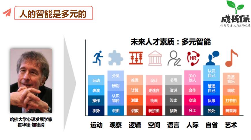 需要指出的是,成长保在线课程体系的设置参考了由美国哈佛大学教育研究院的心理发展学家霍华德·加德纳提出的多元智能理论,即人的智能包括语言、数学逻辑、空间、肢体运动、音乐、人际、内省、自然探索这8个方面。