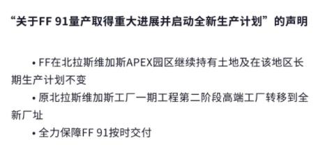 7月11日,法拉第未来公司发布“关于FF 91量产取得重大进展并启动全球生产计划“的声明。声明写到,公司正在进行重大的业务调整:为保障产品按时交付,FF 91高端工厂将迁至新址,并全力改造现有厂房和推进设备采购,尽快实现量产。同时,继续保有北拉斯维加斯APEX工厂地块,建设计划由三期调整为两期。