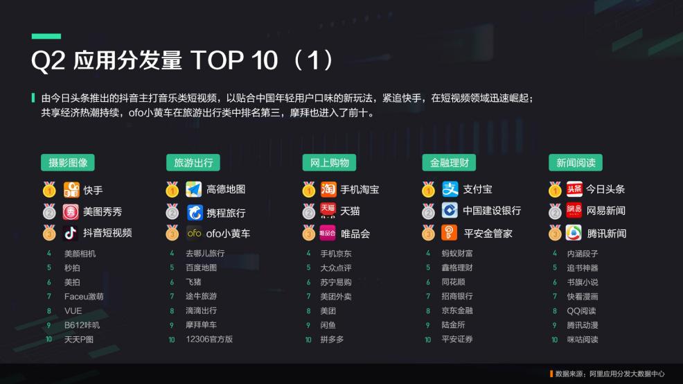 在报告发布同时,阿里应用分发也公布了2017年Q2十大应用类别TOP10。有意思的是,共享单车领域争执不休的ofo与摩拜纷纷上榜旅游出行TOP10,ofo位列第三。站在“共享经济”风口上的共享单车增长态势迅猛, 据行业报道,ofo已占据共享单车行业70%供应链产能,将有望继续扩大领先优势。