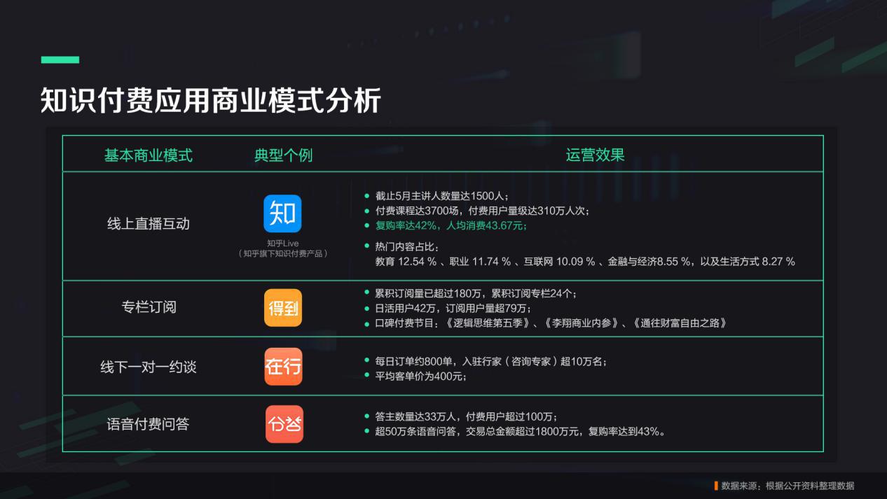 在Q2报告发布同时,阿里应用分发也总结了各大知识付费平台在不同商业模式方面的成果。而作为线上直播互动模式的典型代表,知乎Live的付费课程复购率达42%,人均消费43.67元,这也与直播转瞬即逝的特点不无关系。