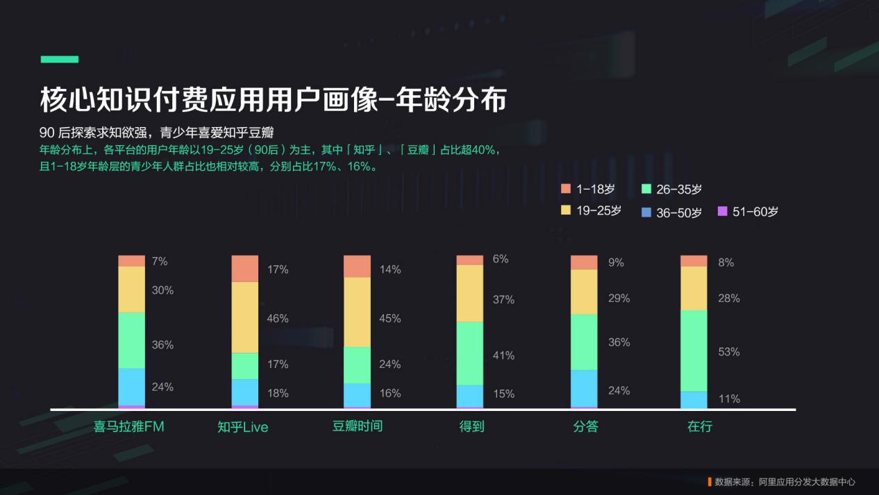 阿里应用分发的这份报告还显示,各大知识付费平台用户以90后为主,均为男多女少。知识内容偏向多领域的知乎、豆瓣90后用户占比最大,男女分布更均衡。知识内容偏技能、实际生活的得到、在行等app 80后用户占比最多,男女差异则略微明显,但各家的用户画像整体上都较为一致。