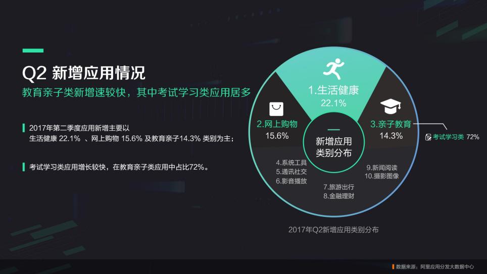 据阿里应用分发统计,在2017年第2季度新增应用中,生活健康类APP是时下行业中的热门,有22.1%的应用属于此类,随后则为网上购物类,占比15.6%,以及教育亲子类,占比14.3%。