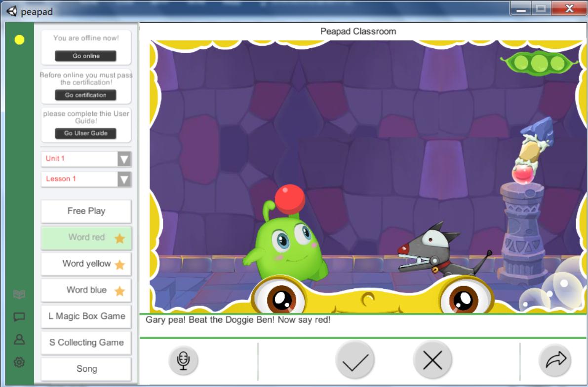 孩子拍拍“小豌豆”的头,启动系统,连线外教;在屏幕上看到的并非真人画面,而是标准化处理后的卡通形象。匹配的真人在教师端操控卡通形象的动作和表情,声音经童音化处理,做自我介绍,引导孩子唱歌、游戏、练习、完成任务、获得爱心。内容分为学习和娱乐两部分,拉拉“小豌豆”的手,进入“神奇的豌豆岛”娱乐,看动画和玩游戏消耗的爱心要靠不断学习才能赚取。