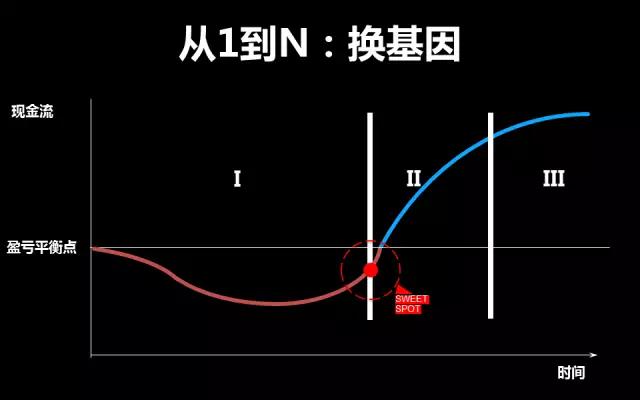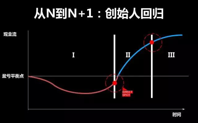 我们看一下,这当中会出现两个拐点。第一个点,硅谷有一个专门的名词“甜点”对应这个点——商业模式通过验证,接下来是复制放大。但是很多创始人在这个点上,40%的人会换掉,80%是被迫的。