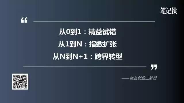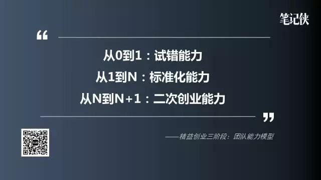 因为每一个阶段,都对应着不同的能力模型。我们看一下,从0到1,我概括为四个字,就是精益试错。从1到N,指数扩张,是标准化和一致性。从N到N+1是跨界转型,这个时候原有的天花板已经到了,需要寻找新的空间。三个阶段的核心能力模型是不一样的。
