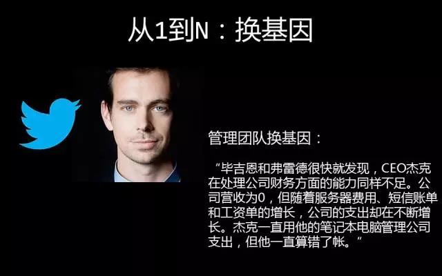 换人是很痛苦的,我们先看一个很有意思的小案例。推特的创始人叫杰克,当这家公司进入从1到N的时候,有两个投资人毕吉和弗雷德发现一个事实: